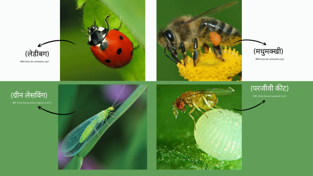 (परजीवी कीट) (स्रोत: https://www.arbico-organics.com/) - शिकारी कीट: ये कीट सीधे हानिकारक कीटों को खाते हैं। उदाहरण: लेडीबग, ग्रीन लेसविंग, प्रेइंग मैंटिस, ड्रैगनफ्लाई।